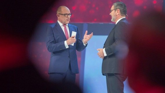 Stefan Schulze-Hausmann moderierte die Jubiläumsgala in Frankfurt am Main und sprach mit der Führungsspitze über die Zukunft sowie die wesentlichen Unternehmens-Leitbegriffe „Menschen, Wirtschaft und Verantwortung“.