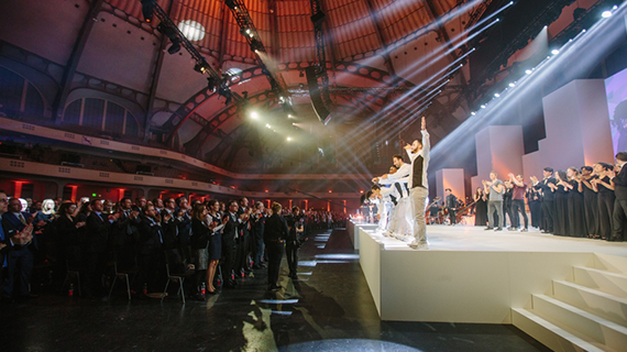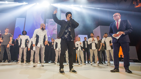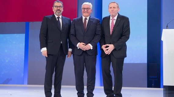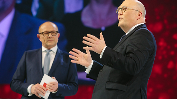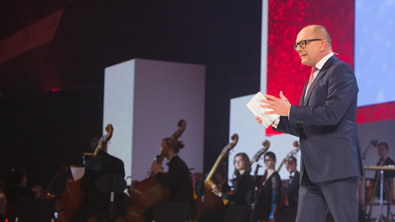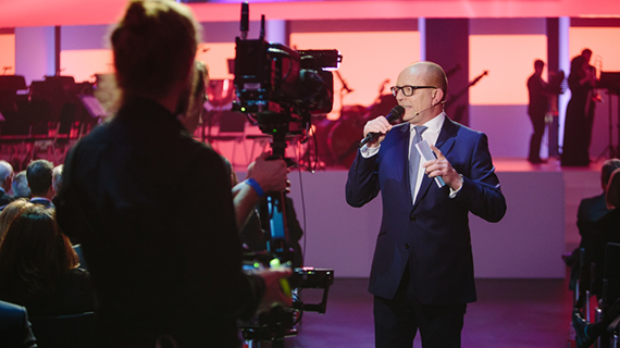 Stefan Schulze-Hausmann moderierte die Jubiläumsgala in Frankfurt am Main und sprach mit der Führungsspitze über die Zukunft sowie die wesentlichen Unternehmens-Leitbegriffe „Menschen, Wirtschaft und Verantwortung“.