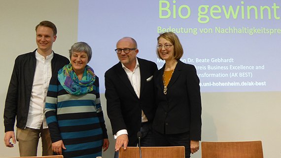 Am 13. Februar stand in einer Podiumsdiskussion das Thema „Bio gewinnt! Welche Bedeutung Nachhaltigkeitswettbewerbe für die Bio-Branche haben“ im Fokus. Auf dem Podium diskutierte Stefan Schulze-Hausmann mit der Marketingleiterin von Rapunzel, Heike Kirsten, und dem Geschäftsführer von Neumarkter Lammsbräu, Johannes Ehrnperger. Die Diskussion leitet Dr. Beate Gebhardt, Leiterin des Arbeitskreis BEST (Business Excellence and Sustainability Transformation) am Fachgebiet Agrarmärkte der Universität Hohenheim.